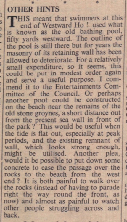 It was touch and go at Westward Ho! on Sunday afternoon, but, in fact, it did not make sufficient a splash. This was at the bathing pool in the rocks which is replenished from the sea. Owing to a series of neap tides, the pool had not been covered for some days and the water had gradually run out of it, which was probably a good thing, otherwise it might have become unpleasant. As Sunday afternoon’s high tide reached its peak youngsters around the edge of the empty pool raised a cheer as the water began to splash over. A tide an inch or two higher would have filled the pool in time for that day, but as it was it had to await the next tide for replenishment.