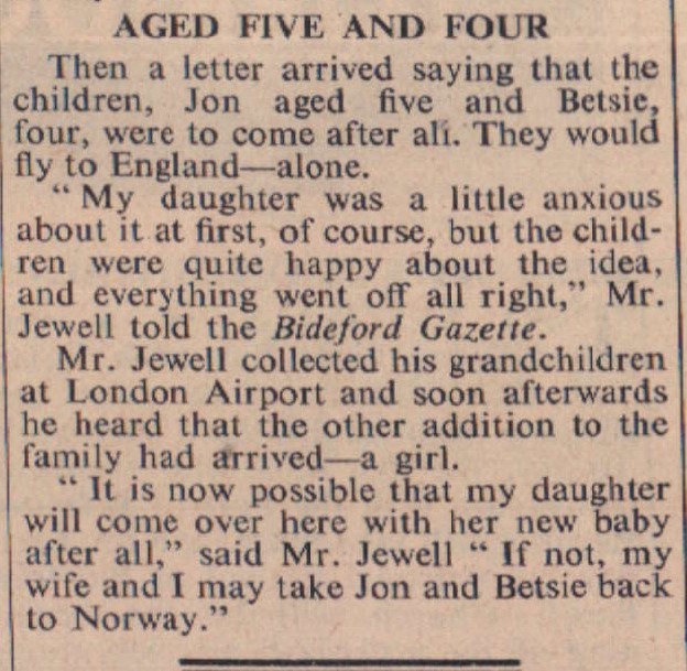 Mr Hector Jewell, an Appledore butcher, has good reason to be proud of his grandchildren. When his daughter Jean married a Norwegian and became Mrs Hafslund, of Ski, Norway, the families promised that they would see as much as they could of each other and it was arranged that about once a year, Mrs Hafslund should come home for a holiday with her family. But this year, as she was expecting a third chid and her husband, a skipper of a cargo vessel was at sea, it seemed that Mr Jewell, of Odun Farm, Appledore, would not see his daughter or her family.