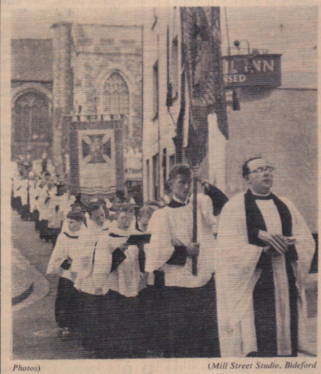 A feature of the patronal festival of St Mary, marking the beginning of the celebrations of the 700th anniversary of Bideford Parish Church, was the procession of public witness through the streets prior to evensong. Over 60 clergy and local and visiting choristers led the congregation in singing hymns as the procession was made from the Church, through Allhalland Street, High Street, and back along Bideford Quay, through the 1259 Norman tower into the Church. The Rector, Rev T Derwent Davies, was at the Church to receive gifts from 6am until 7pm, and one donor arrived before 6am! The oldest parishioner to call was an 88 year old man, the youngest, a girl of three.