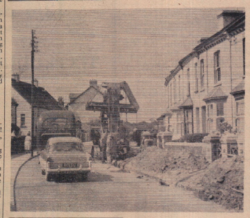 Throughout the peak period of summer traffic work has proceeded on a £15,000 scheme to put in a section of new main to boost the water supply to houses served by the high level reservoir near Handy Cross. Excavations have been made up Pitt Lane, High Street, Old Town, Clovelly Road and also in Honestone Street. Despite the possibilities of inconvenience, indicator control of traffic has kept a steady flow each way. The photograph shows progress at the top of Clovelly Road.