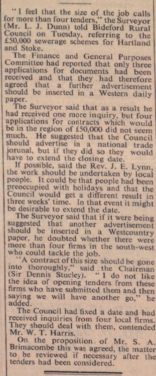 £50,000 sewerage schemes for Hartland – the surveyor, Mr L J Dunn, calls for more tenders.
