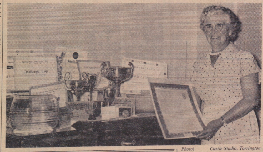 Seen with the trophies and special certificates she has won at local shows this year is Mrs M E Harris, of Frost Meadow, Langtree. She has won over 100 prizes and five cups this season.