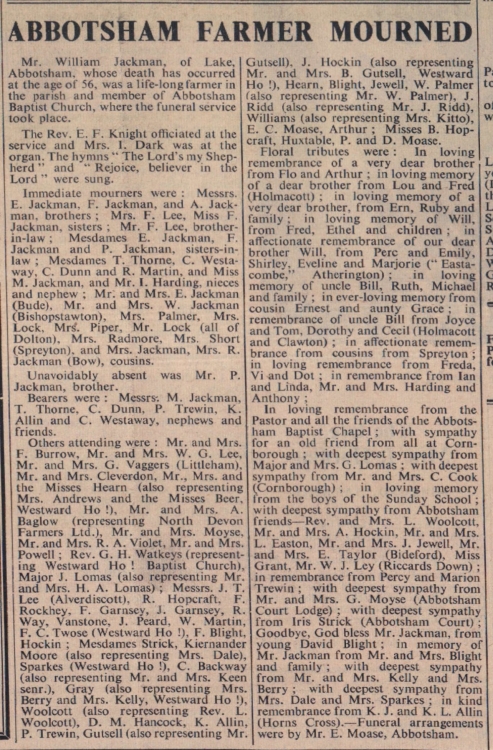 Abbotsham farmer, Mr William Jackman, of Lake, is mourned.