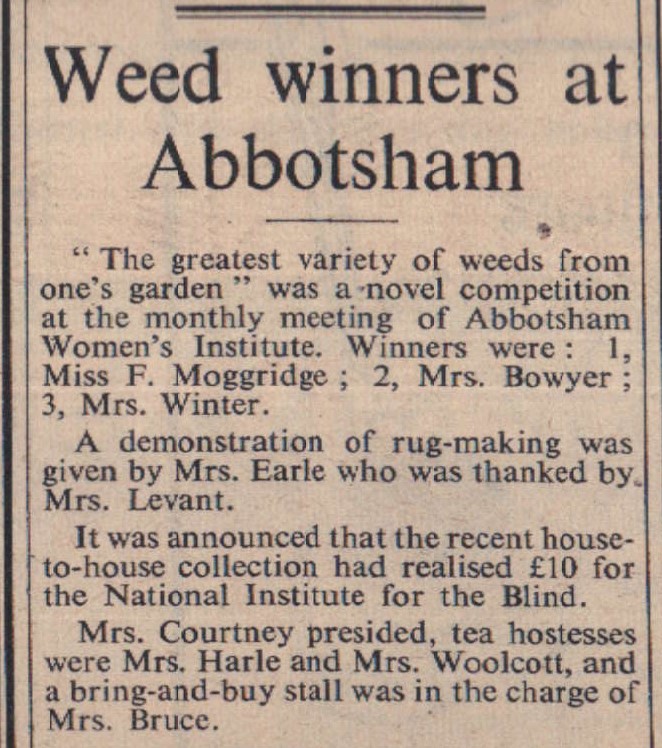 Weed winners at Abbotsham were Miss F Moggridge, Mrs Bowyer and Mrs Winter.