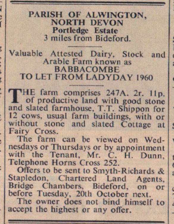 Mrs Sybil Tucker, who has lived at the New Inn, Abbotsham, for the past 50 years, has retired and is making her home in the adjoining cottage. At Bideford Petty Sessions the licence was transferred to her son, Mr Donald Henry Tucker. Mrs Tucker succeeded her husband as the licensee on his death some 13 years ago. Previously her parents were licensees there. Announcing that the transfer would be granted, Mr R B Blackmore, presiding, said that the justices had associated Mrs Tucker with the New Inn for a long period and she had had an honourable tenancy there. The time came when all had to give way to others, even though it was not always pleasant. “We are pleased that you are going out in such an honourable way,” he added.