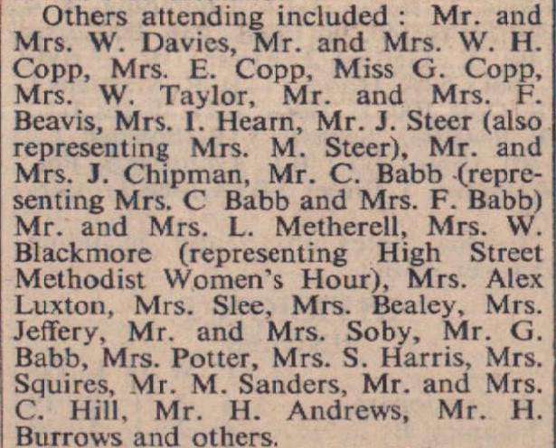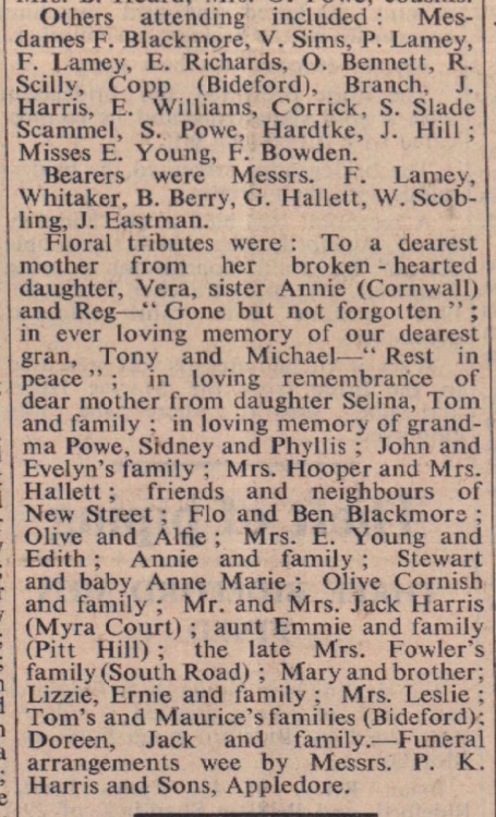 Many friends attended the funeral at Higher Cemetery of Mrs Elizabeth Ann Penhale, who died at the home of her daughter, Mrs Leonard Copp, of Strawberry Cottage, at the age of 90 years. Mrs Penhale was the widow of Mr John Penhale, late of Buckland Brewer, and of 47 Meddon Street. The Rev G E Gregory officiated, assisted by the Rev R H Foster, with Miss G Glover as the organist. Immediate mourners were: Mr and Mrs L Copp; Mr and Mrs G Penhale and Mr and Mrs B Bulley; Mr and Mrs D Copp; Mr and Mrs S Cann and Shirley; Mr and Mrs G Davies and Mr C Cory. Unavoidably absent were: Mr W Penhale, and Mr H Prance. Both are in New Zealand.