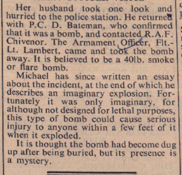 When Mr Ron Littlejohns of 57 Elm Grove, Bideford, returned home, his wife told him there was a bomb at the bottom of their garden. Their son, Michael, and his friend, Richard Smith, of Mill Street, had come across the bomb while playing in the vicinity and had innocently hauled it up on top of the garden shed.