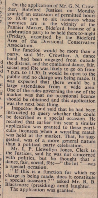 Winning the North Devon Constituency for the Liberals will cost Mr Jeremy Thorpe two bottles of champagne when he visits Hartland Quay Hotel; and he will enjoy meeting his obligation with a flourish. At the beginning of the by-election campaign in the Torrington division, just over 18 months ago, Mr Thorpe, while on a visit to the hotel, was ribbed about Liberal prospects. This led him to promise to stand a bottle of champagne in the bar if and when Mr Mark Bonham-Carter, the Torrington Liberal candidate, was returned. Mr Bonham-Carter went on to win the by-election and, remembering his promise, Mr Jeremy Thorpe sometime ago revisited Hartland Quay Hotel and bought a bottle of champagne which was shared out among those present who were Torrington electors. Toasts were ‘No re-count next time’ and ‘May the best man win.’ To these everyone, whatever their political opinions, could drink with equal sincerity. Mr Jack Walter, with whom Mr Thorpe made the original bet: ‘When I get in I’ll stand you two bottles.’ So, as they say, Jack and his fellow electors in the neighbourhood of Hartland Quay will be all right. But Mr Thorpe will be toasting with mixed feelings for whereas he is in Parliament, Mr Mark Bonham-Carter is now out.
