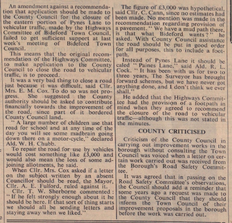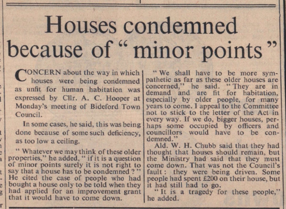 Tenders of £452 from Messrs Blanchards for improvements to two houses at Halsbury, Parkham, was accepted by Bideford Rural Council. Total cost of improvements to the houses, including the laying of a water main by the North Devon Water Board, would be £596 11s 9d, the Council told, and they agreed to make application, subject to the necessary assurances, for loan consent to the extent of £597, repayable over a period of 20 years by half-yearly instalments.