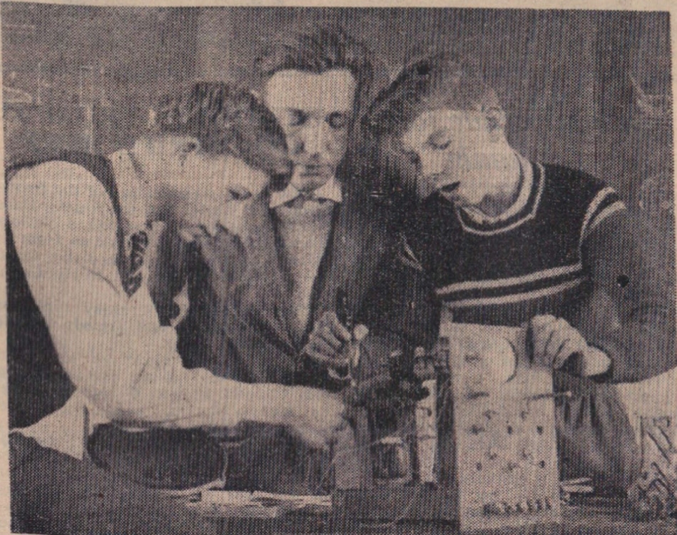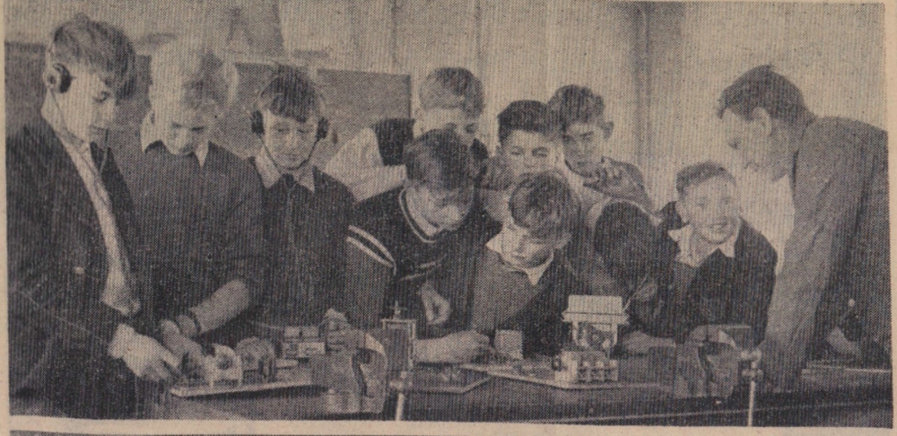 Young sparks! Yes, and bright ‘young sparks’ too, for they are members of Bideford County Secondary School radio club which is recommencing its activities after half-term, following summer recess. The Club is under the supervision of Mr D T Bailey, metal work teacher at the School, seen watching them in the photographs as they share construction and repair work on sets. Christopher Bonner has progressed to the stage of making a push-pull amplifier, and Jimmy Colwill has built his first transistor set.