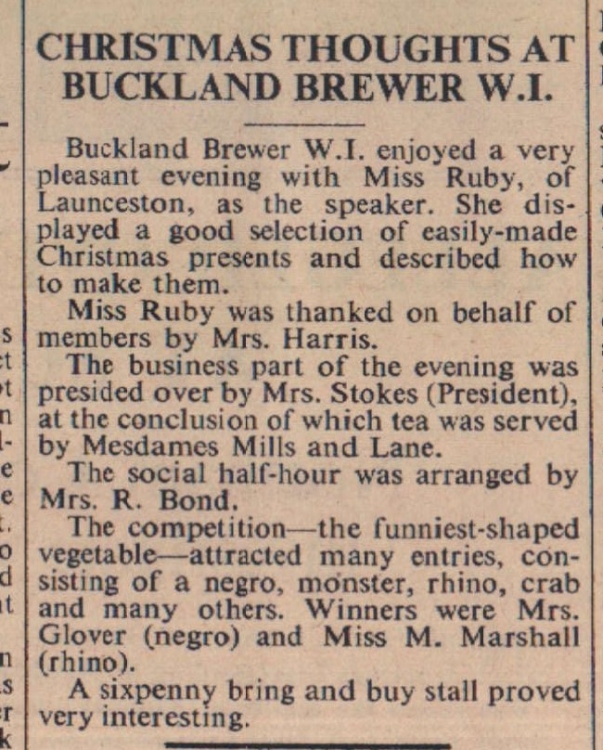 Buckland Brewer WI, presided over by Mrs Stokes, enjoyed a very pleasant evening with Miss Ruby, of Launceston.