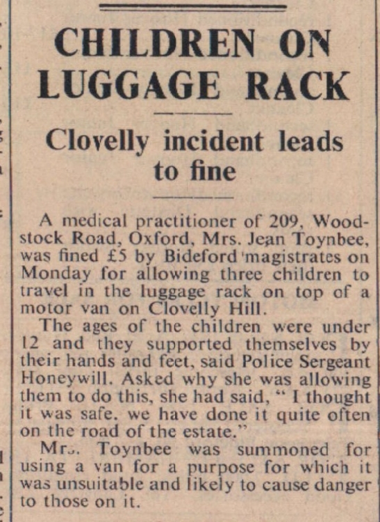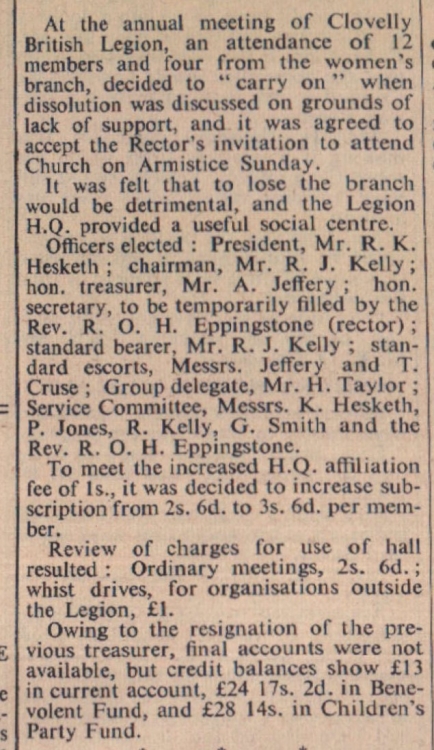 Clovelly Ladies’ Lifeboat Guild show receipts of just on £240 for the past year. Main items include: Whist drive, £24; Flag day, £64; Lifeboat boxes – Mrs L Symons, £1; Mrs H A Burrow, £3 10s; sale of Lifeboat books, Miss H Jewell, £58; Mrs M Morris, £84; subscriptions, £4 10s.