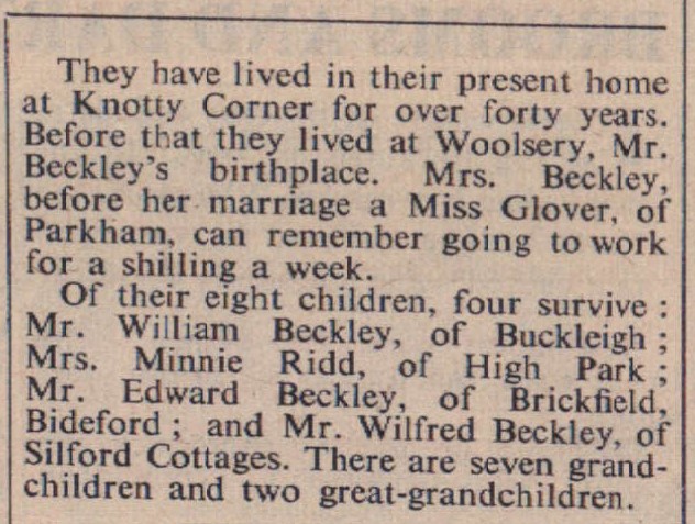 Every Wednesday 80 year old Mr George Pett, of Moorfield, Shebbear, sets off on a three-mile cycle ride for a whist drive. His wife, aged 77, is just as energetic, for she enjoys attending village dances. Last week Mr and Mrs Pett celebrated their golden wedding anniversary at their home. There was a family party at which their three children – Mrs Molly Sanders, of Pitt, Shebbear; Mr Richard Pett, of Berry Farm, Shebbear; and Miss Marion Pett, who lives with her parents – were present. Also at the party were the couple’s four grandchildren and two great-grandchildren, the youngest being 2 weeks old John Chamberlain, son of Mrs Sanders’ youngest daughter. Mr Pett was born in Shebbear and went to school there. His father farmed Barn, and when Mr Pett left school he helped on the farm. His wedding to Miss Edith Baulkwill, of Landcross, a farmer’s daughter, took place at Monkleigh Church on September 22nd 1909. During the 1914-18 war Mr Pett served with the Devon Yeomanry in France and on his return farmed Barn. He bought Berry Farm and continued to work the combined farms until his retirement when he went to live at Moorfield, a smallholding. Mr Pett, who often helps his son with work on the farm, has several hobbies. In particular he likes cards, cricket and horses. Mrs Pett still does her own housework and helps her daughter with managing the house.