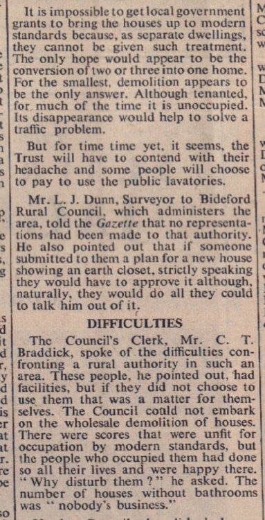 In Hartland there are houses, the tenants of which have to cross the main road and walk about 50 yards, latterly through a patch of ground overgrown with weeds and nettles, in order to reach their lavatories – chemical closets housed in semi-derelict stone hovels. Some of them prefer to use the town’s public lavatories nearby. The houses in question belong to the Town Trust but a Bideford Gazette representative was told that there are plenty not belonging to the Trust where similar conditions obtain. As usual, finance is at the bottom of the trouble, even though it is not the whole story. The properties in the main are let at absurdly low rents – there has been no increase at least since before the first World War. Only two of the dozen cottages owned by the Trust produce what could be termed real revenue and that is merely because they have recently been re-let. Some of the other houses are so small and so constructed that improvements are wholly impracticable. A number of them have no back doors, let alone yards where toilets could be built. That does not apply to all. “We offered to build lavatories here once but the sanitary authorities would not allow it because there was insufficient water for the flushing purposes” said the Trust member. Some of the houses have lavatories on the sewer but they have to be flushed with buckets of water.