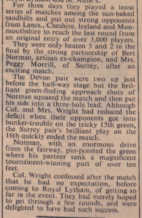 Local golfers, Col and Mrs W Wright, of Myrtle Cottage, Instow, and the Royal North Devon Golf Club, put up a first-class performance to reach the final of the nation-wide Daily Mail amateur mixed foursomes tournament, closing stages of which were played on the gruelling championship course at Royal Lytham and St Anne’s.