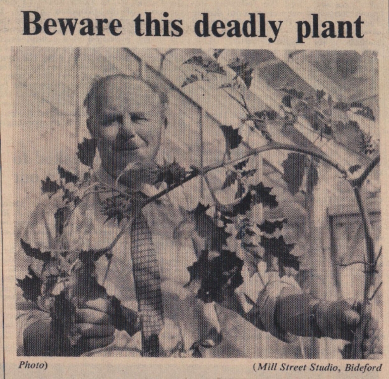 Lt-Col W B Churchill-Longman, of Heale House, Littleham, displays a ‘deadly’ plant he has identified in his conservatory. The Ministry of Agriculture have been warning farmers, country families and weekenders against this rare sub-tropical plant which has made its appearance in this country. It is the Datura stramonium, or American thorn-apple, which is described as very deadly to small children or to cattle. Dangerous drugs, sometimes used as narcotics, are extracted from the plant in countries where it grows naturally. In February, Mr M P Moore, found a similar specimen in his garden at Eastover, Mount Pleasant, Bideford.