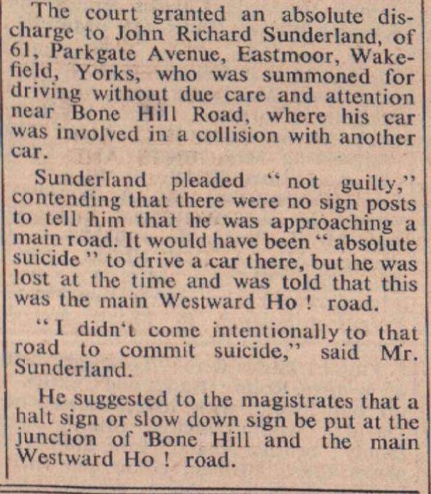 A strong recommendation that something should be done about signposts at the corner of Bone Hill, Northam, so that future accidents should be avoided, was made by the chairman of Bideford magistrates, Mr T C Buckland.