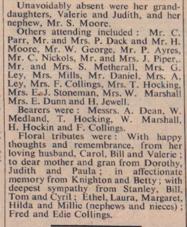 The funeral has taken place at the Parish Church, Parkham, of Mrs Mabel Peard, of Hordlands, Parkham. She was 72. The Rev J E Lynn conducted the service, and the organist, Mr M Chubb, accompanied the singing of the hymns. Immediate mourners were: the husband, Mr Fred Peard; Dorothy and Caroline, daughters; Paula, granddaughter; Mr W Kelly, son-in-law; Knighton and Betty, brother and sister-in-law; Mr W Moore, Mr T Moore, Mr C Moore, Mrs L Hockin, Mrs Tucker, Mrs E Wren, nephews and nieces.