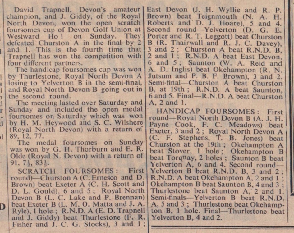 Royal North Devon Golf Club success in County foursomes at Westward Ho! with David Trapnell and J Giddy winning the open scratch foursomes cup of Devon Golf Union.