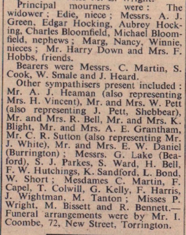 A representative congregation attended the funeral at St Nectan’s Parish Church, Hartland, of Mr Ernest William Pyne, who died suddenly at his home at Blagdon at the age of 74. Family mourners were: Mr and Mrs E Barnes, Mr and Mrs R Buckler, Mr and Mrs J Pyne, Betty and Peter Barnes, Rex and Rita Drayton, Mr F Pyne, Mrs F Pyne, Mr P Pyne, Miss L Vinnacombe, Mrs E Vinnacombe, Mr W Heal, Mr and Mrs F Butler and Marion, Mr L Middle, and Mrs Harris. Bearers were Messrs M Heard, W Slee, E Davey, I Brimacombe, A Smith and Curry. There were fifty floral tributes.