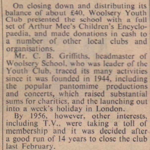 At Woolsery there was much local interest in a presentation ceremony at the School. Referring to the Woolsery Youth Club, Mr Griffiths, said, amid laughter “I think in some quarters the Club was looked upon as a matrimonial agency.” Referring to the club decision to help others, Mr Griffiths said it was so refreshing, when one heard and read so much about gangs, Teddy Boys and violence, to find a club giving such gifts so generously. He was very proud that they were such a credit to the community. Seen in the picture are: Mrs E Johns, Mr C B Griffiths, Rosemarie Souch, Mr Jim Vanstone, Mr J Raffe, Mrs Raffe, Mrs J Jenn, Mr Ron Westlake and Mr Ron Chapple.