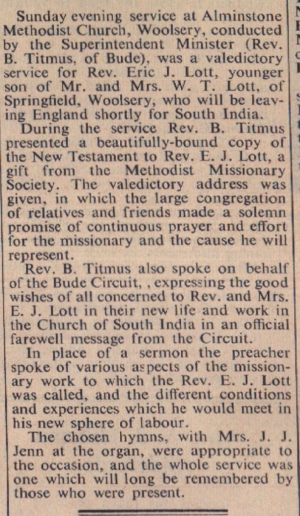 Off to mission work – valedictory service and gift at Woolsery as Rev Eric J Lott, younger son of Mr and Mrs W T Lott, of Springfield, Woolsery, will be leaving England shortly for South India.