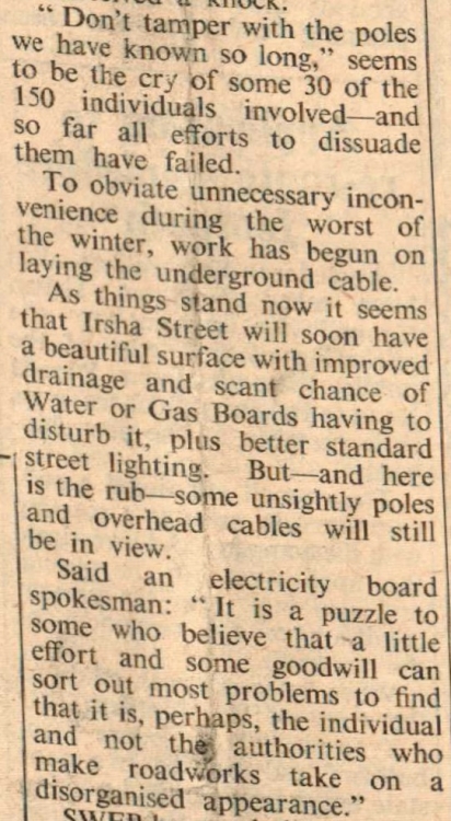A concerted move to tidy up Irsha Street, one of the jewels of Appledore’s conservation area, looks like being frustrated by a minority of its inhabitants. For many years local people with every justification have campaigned for the narrow picturesque street to be properly surfaced and drained. The public utility companies agreed to cooperate with the Council in carrying out outstanding work and, more importantly, the South Western Electricity Board agreed to replace their unsightly overhead distribution lines with underground cable. And that is where the project has received a knock.