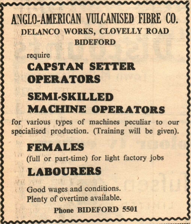 Operators needed by Anglo-American Vulcanised Fibre Co, Delanco Works, Clovelly Road, Bideford.