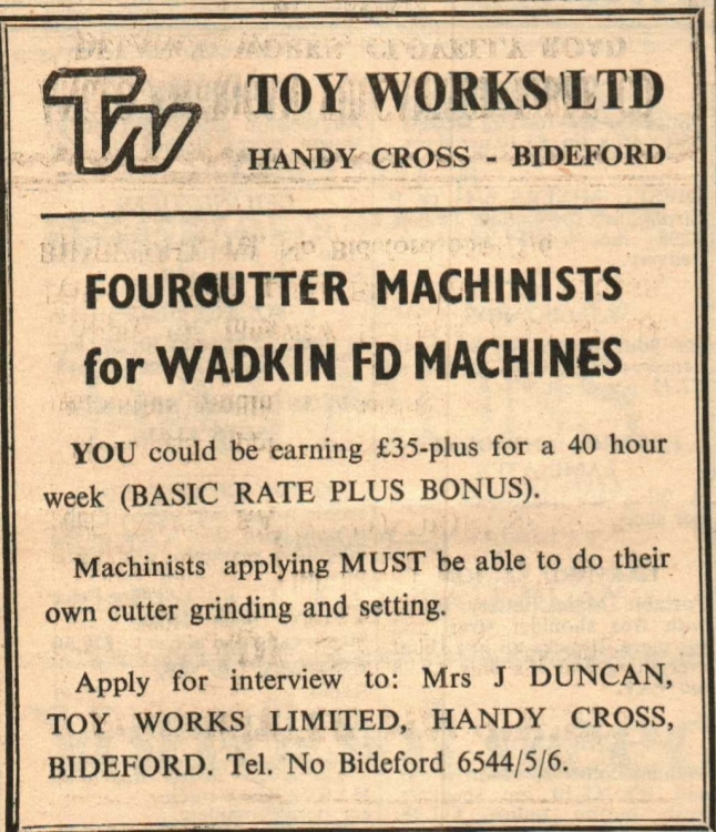 Machinists needed at Toy Works Ltd. Apply to Mrs J Duncan.