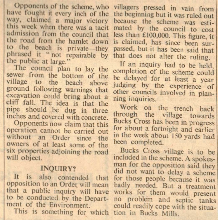 The battle of beauty spot Bucks Mills has taken a new turn. Local people who are fighting Bideford Rural Council’s plan to pour crude sewage into the sea there have asked Mr Peter Mills, MP, to lay the whole matter before the Ombudsman.