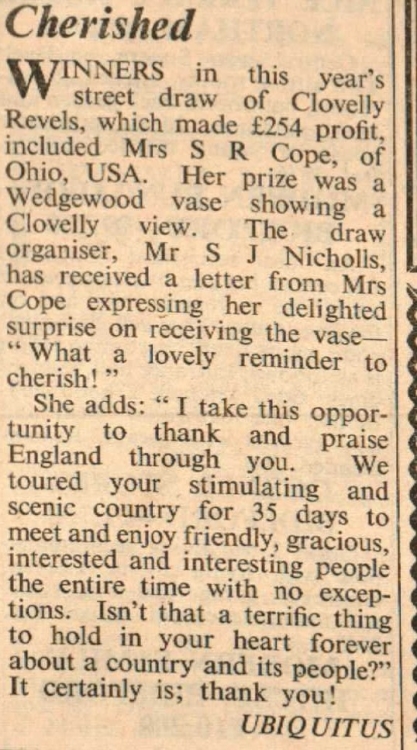 Mrs S R Cope of Ohio, USA, wins a Wedgewood vase with a Clovelly view.