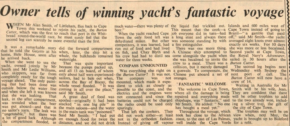 Mr Alan Smith, of Hele House, in Littleham, tells the Gazette of the remarkable first leg in the yacht, the Burton Cutter, jointly owned by him and Mr Leslie Williams, which was the first to reach Cape Town in the Whitbread round-the-world race. Later in the month it was reported that the ketch Burton Cutter was in Port Elizabeth for repairs. Reporting by radio telephone, Leslie Williams said everyone was safe but naturally despondent.