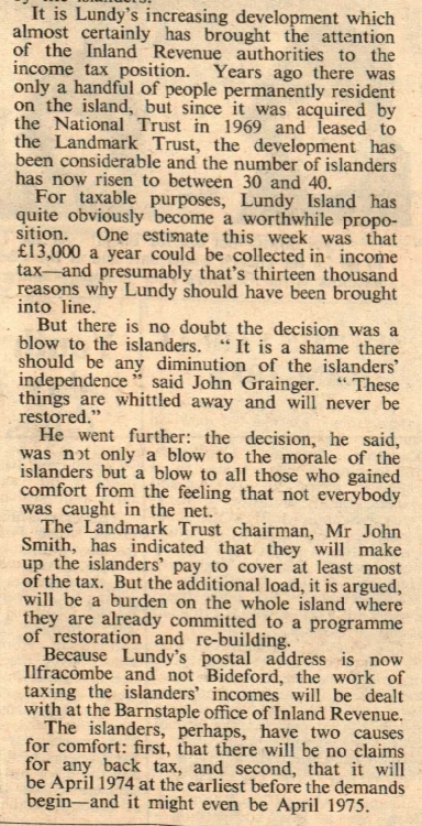 Lundy’s so rugged wall against officialdom crumbled with the news that residents on the island will soon pay income tax. Predictably, the reaction of the people on Lundy was one of dismay. Island agent, Mr John Grainger, said “It’s a sad day for Lundy but it is a fait accompli and it looks as though we shall have to grin and bear it.” To pay no income tax was one of the benefits enjoyed by the islanders. “There is some comfort to be gained, perhaps, by the thought that at least they can go on drinking in the island’s only pub, the Marisco Taavern, unhampered by the mainland restriction on licensing hours – and they don’t pay rates either.”
