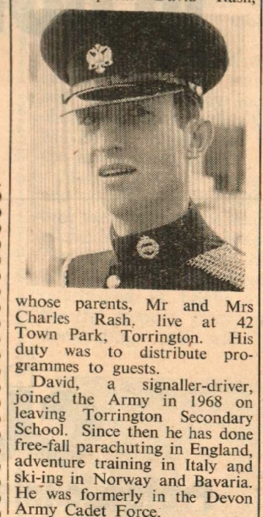 One of the soldiers of the 1st The Queen’s Dragoon Guards chosen to be on duty at the wedding of Princess Anne and Captain Mark Philips was Lance-Corporal David Rash, whose parents Mr and Mrs Charles Rash, live at 42 Town Park, Torrington. David, a signaller-driver, joined the Army on leaving Torrington Secondary School.