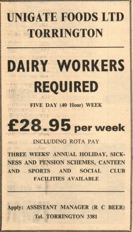 Unigate Foods Ltd, Torrington, need dairy workers. Apply to the Assistant Manager, R C Beer.