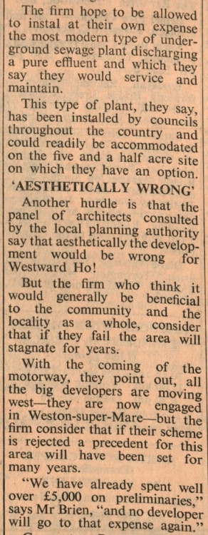 A £1 million residential development scheme for Westward Ho! hangs in the balance. Geocrest Properties Ltd, of Weybridge, want to build four blocks of flats similar to those at Torquay providing between 90 and 121 two and three bedroom homes to sell at about £11,000. But although, as managing director Mr Peter J Brien puts it, the planning authority ‘have been extremely helpful, cooperative and adventurous’ the problem is sewerage.
