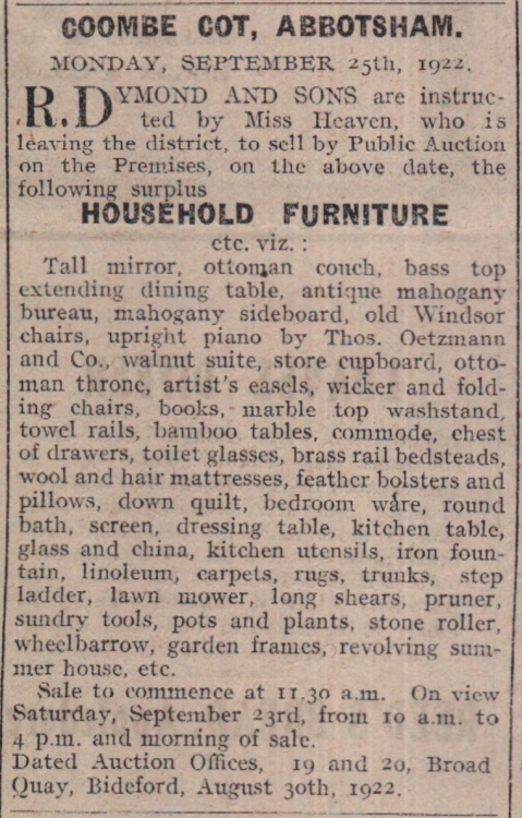 Household furniture from Coombe Cot, Abbotsham, is to be sold by Public Auction.
