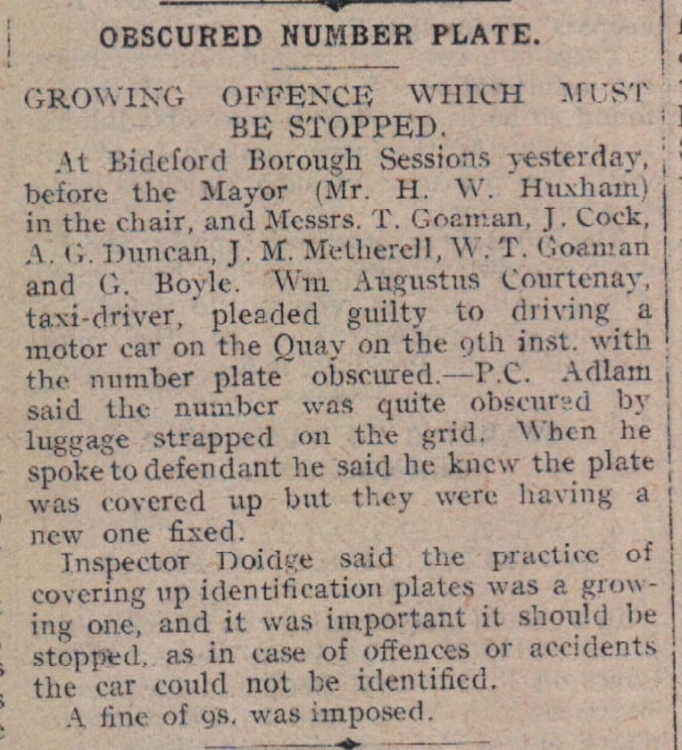 William Augustus Courtenay is fined 9s for driving with a number plate which was obscured.