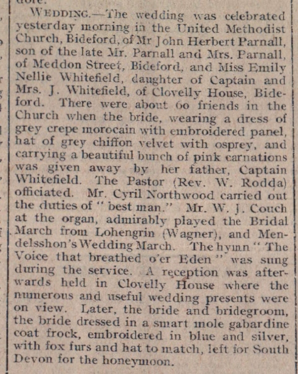 Mr John Herbert Parnall marries Miss Emily Nellie Whitefield, of Clovelly House, Bideford.