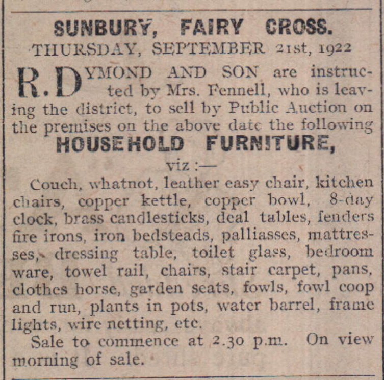 Household furniture from Sunbury, Fairy Cross, is to be sold by Public Auction.