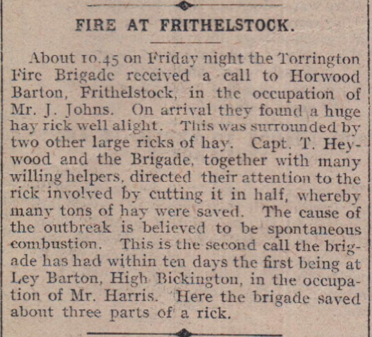 Fire at Horwood Barton, Frithelstock which Capt T Heywood and the Brigade attended.