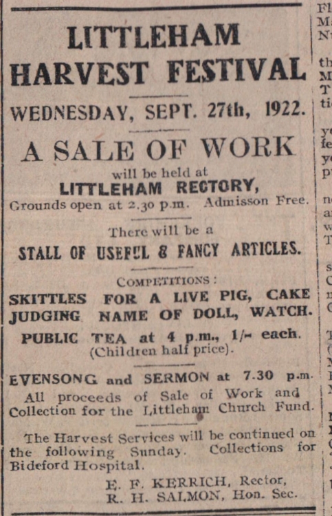 Littleham Harvest Festival to take place on Wednesday September 27th 1922.