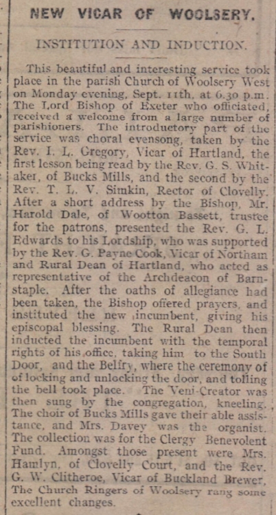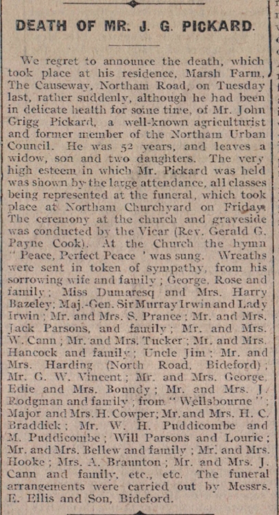 Births, marriages and deaths advertised – Gibson – at 13 Mount View Road, Crouch Hill, London, to Christine (nee Maunder), the wife of Captain T Gibson, a son; Purkiss – to Mr and Mrs R C Purkiss (nee Phyllis O’lliffe), 37 Ennsmore Gardens, SW, a son; Goundry-Matthews – at Bideford, the Rev John Alfred Goundry to Hilda May, daughter of Mr and Mrs Mathews of Appledore; John Grigg Pickard, age 52 at Marsh Farm, Northam; Burridge-Ball – at St Mary’s Church, Bideford, Leslie William Burridge to Millicent Sophie Louise Ball, of 5 Salisbury Terrace (by special license); Barrow-Dingle – at Lavington Congregational Church, Roland James of Torridge House, to Dorothy Christine, Buttgarden Street; Powell-Hancock – at Weare Gifford, Robert Cunningham to Mary Margaret of The Hill; Elizabeth Jane Couch, of Bideford, at 7 Richmond Terrace, Appledore, aged 58; William May at 15 Pitt Hill, Appledore, aged 58; Edward Parnell, aged 25; Frances E Wren, widow of Capt. Robert Fellowes Wren; Parnall-Whitefield – at the United Methodist Church, Bideford, John Herbert to Emily Nellie; to Mr and Mrs C F Butcher (nee Olive George, Parkham), a son; Bartholomew-Oliver – Reginald to Elsie, both of Bideford (by special license); Daniel-Mills – at Beaford Parish Church, Reuben Daniel of Alwington, to Emily Mills; Prust-Fulford – Florence Mabel Fulford of Torridge Hill, Bideford, to Frank Prust of Morwenstowe; Symons-Delbridge – Herbert Charles, Terminus Inn, East-the-Water, to Elsie Doreen, East-the-Water Post Office; Hilda Braund, the dearly beloved and only daughter of Mr and Mrs J Braund, Bucks Mills; The Rev John Dene of Horwood House, Bideford; Caroline Thompson in her 75th year; and Reginal James Stafford Pengilley at the Union Club, Westward Ho!