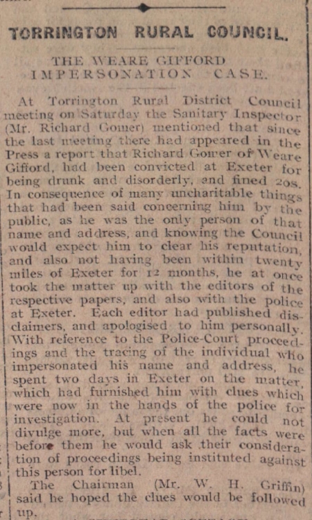 A week or so ago hotel proprietors at Bideford and Exeter were imposed upon by a bogus Earl ‘out for a good time.’ At Exeter a man, who had imbibed not wisely but too well, found safe lodging in the City police court cell, and brought before Exeter Magistrates, airily remarked “I want to settle it as quick as I can, and not make a fuss about it: I am a stranger to the city.” He gave his name as Richard Gomer of Wear Gifford. We are asked to state on behalf of Mr Richard Gomer, Sanitary Inspector of Wear Gifford – and so far as can be ascertained the only person in the parish of that name – that he is not the person who gave the same name and place to the magistrates and in fact was not away from home at the time. Later that month, the issue was discussed at a meeting of Torrington Rural District Council.