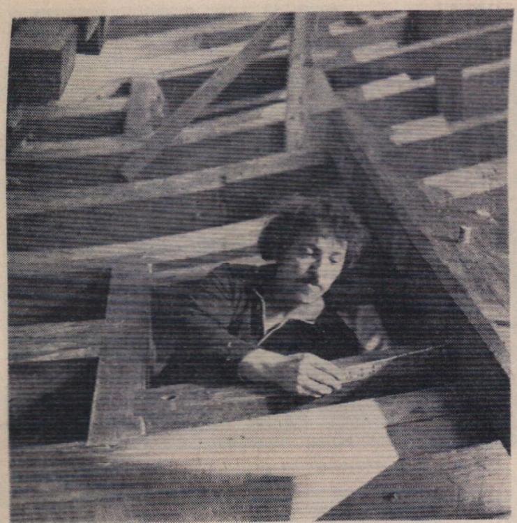 Mr Alan Craner, one of the shipwrights, checks the dimensions of a gunport on the full-size replica of Sir Francis Drake's Golden Hinde under construction at the shipyard of J Hinks and Son, Appledore. The replica, which is scheduled for launching in April next year, is now half-way to completion. After launching the Golden Hinde will stop at a number of South Coast ports and moor for three months in the Pool of London before retracing under sail Drake's voyage across the Atlantic to Panama.