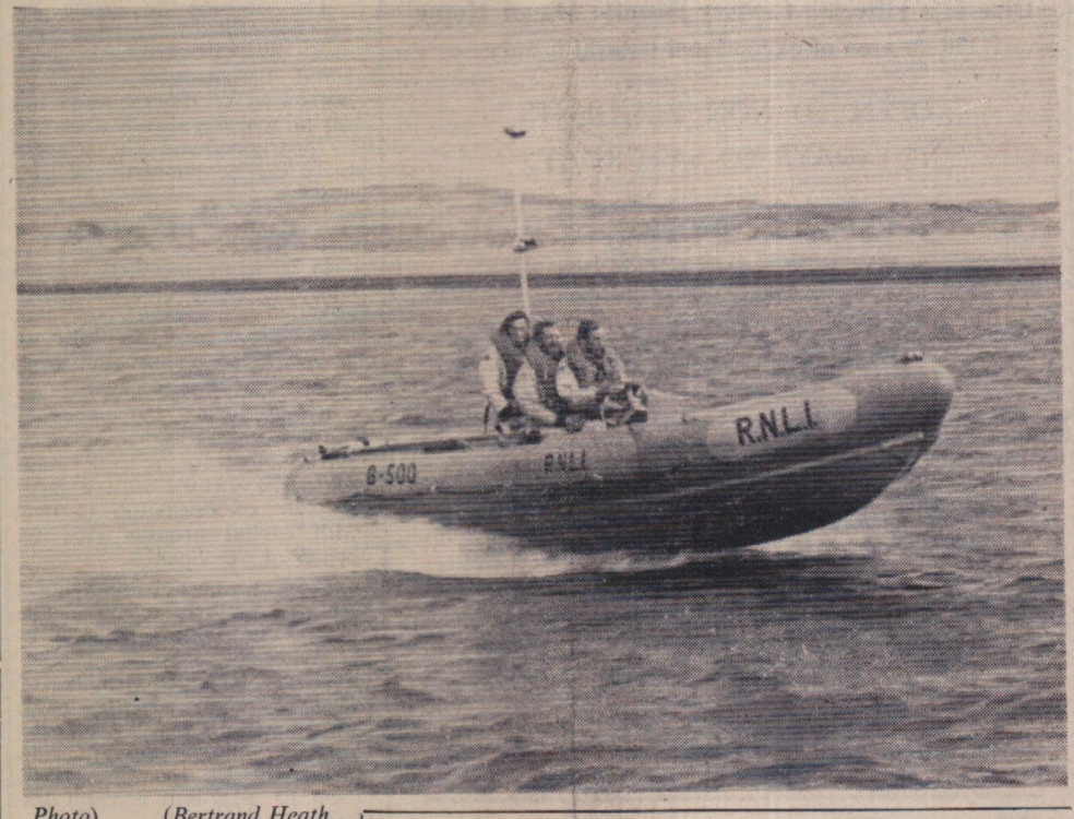 Flat out - the inshore rescue boat now on evaluation tests at Appledore. A new type of craft, she is now hitting top speed again after a fortnight's delay during which a new engine was fitted. One idea of the trials is to familiarise local lifeboat crewmen with such craft which many experts believe could do much to fill a gap in local rescue services when the helicopter flight departs on the closure of RAF Chivenor.