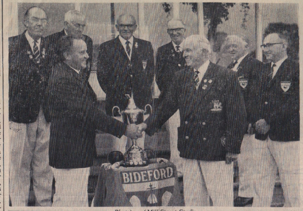 A moment of memories for Mr Arthur Hooper as he congratulates Mr Ron Cole, captain of Bideford Victoria Park Club, on the club’s achievement in winning the Devon County Bowls Trophy. Mr Hooper is the only surviving member of the Club team that last brought the trophy to the town in 1935.