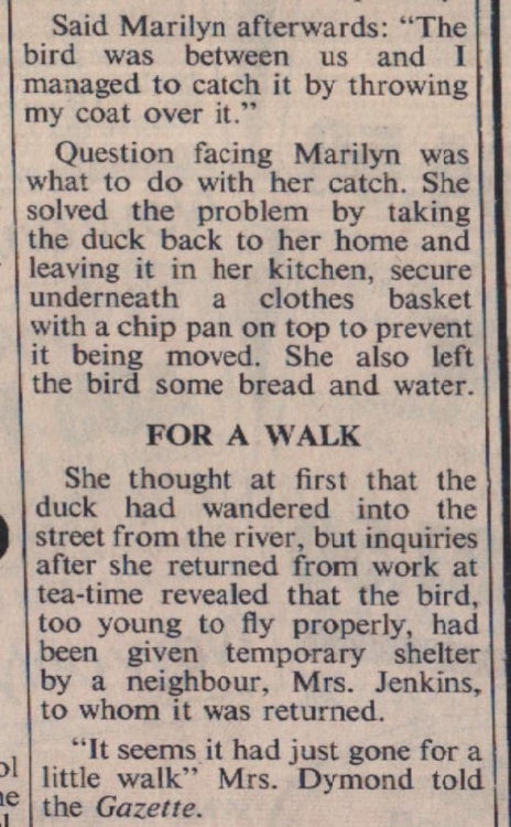 Sorry I’m late – I had to catch a duck! This was the excuse – unlikely but true – which 20 year old shop assistant Mrs Marilyn Dymond had for her supermarket boss this week. Marilyn was shutting the front door of her house at 72 Clifton Street, Bideford, when she saw a duck making rapid progress down the hill. In chase was Mr Ron Somerville, who had been washing his car in the street when he saw the duck pass by.