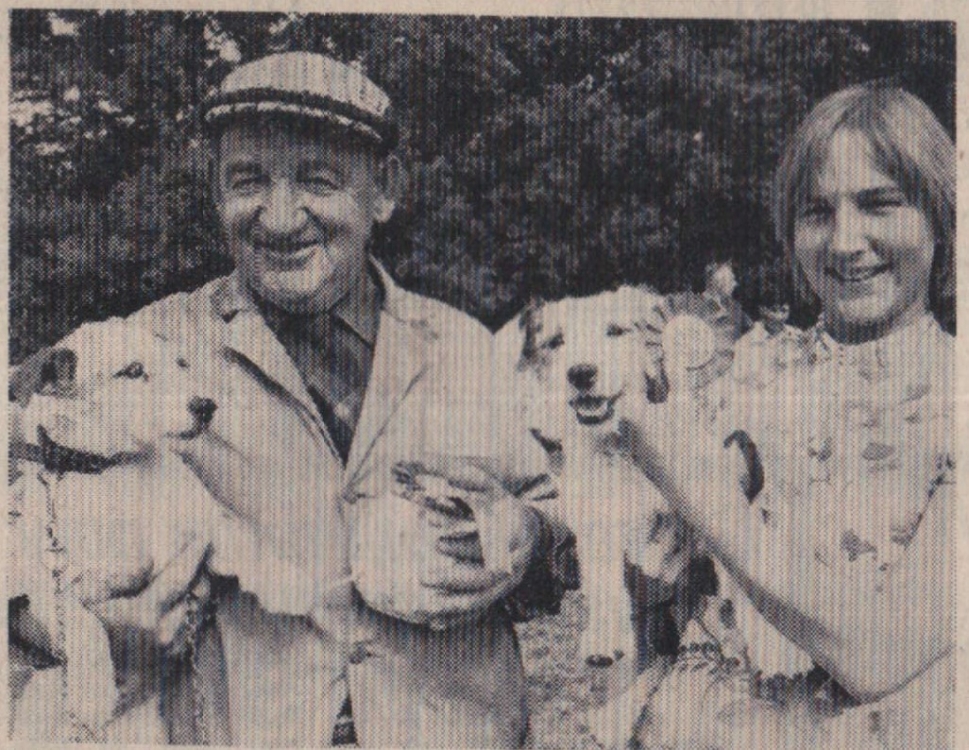 Mr L Grills of Torrington, and his daughter, Mrs J Brooks of Monkleigh, with the first and second prize winning terriers at the Stevenstone Hunt Supporters’ Club terrier and family dog show, held at the Old Kennels, near Torrington Station.