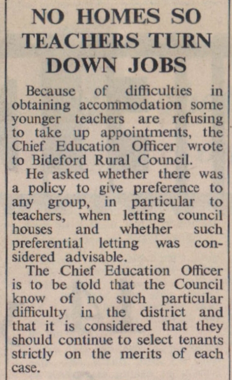 Presentations at Appledore – an interesting ceremony took place at the United Council Schools Appledore when the esteemed headmaster, Mr J Mathews, who is retiring from the profession (having reached the age limit) was presented with a gold mounted fountain pen and handsome leather initialled suit case. He is succeeded by Mr S V Ford. Miss H M Mathews, LLA (Mistress), who is leaving to be married, was presented with a pair of sterling silver candlesticks suitably engraved.